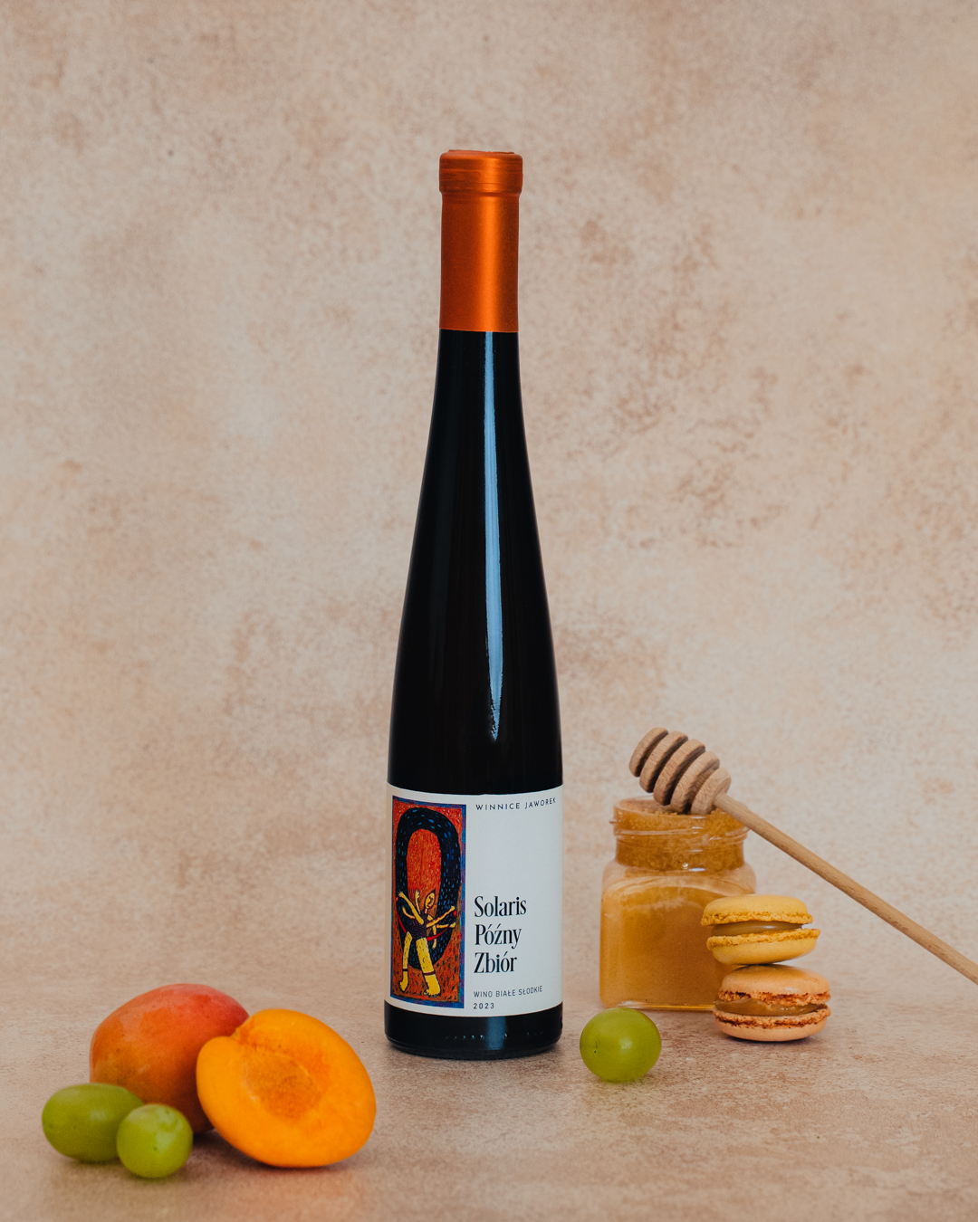 Solaris Późny Zbiór 2023, białe deserowe wino, w niecodziennej odsłonie, opartej na winifikacji obejmującej bardzo późny zbiór oraz leżakowanie w dębowej beczce. Tak dojrzałe grona nadały winu ciemną, słomkową barwę oraz pełnie słodyczy i niezwykle intensywny aromat i smak miodu, dojrzałych moreli, ale też wyczuwalną nutę marakui, która uwydatnia orzeźwiający charakter wina. Niezwykła odsłona Solarisa, doskonale komponująca się z deserami czy miękkimi serami, wino na wyjątkową okazję